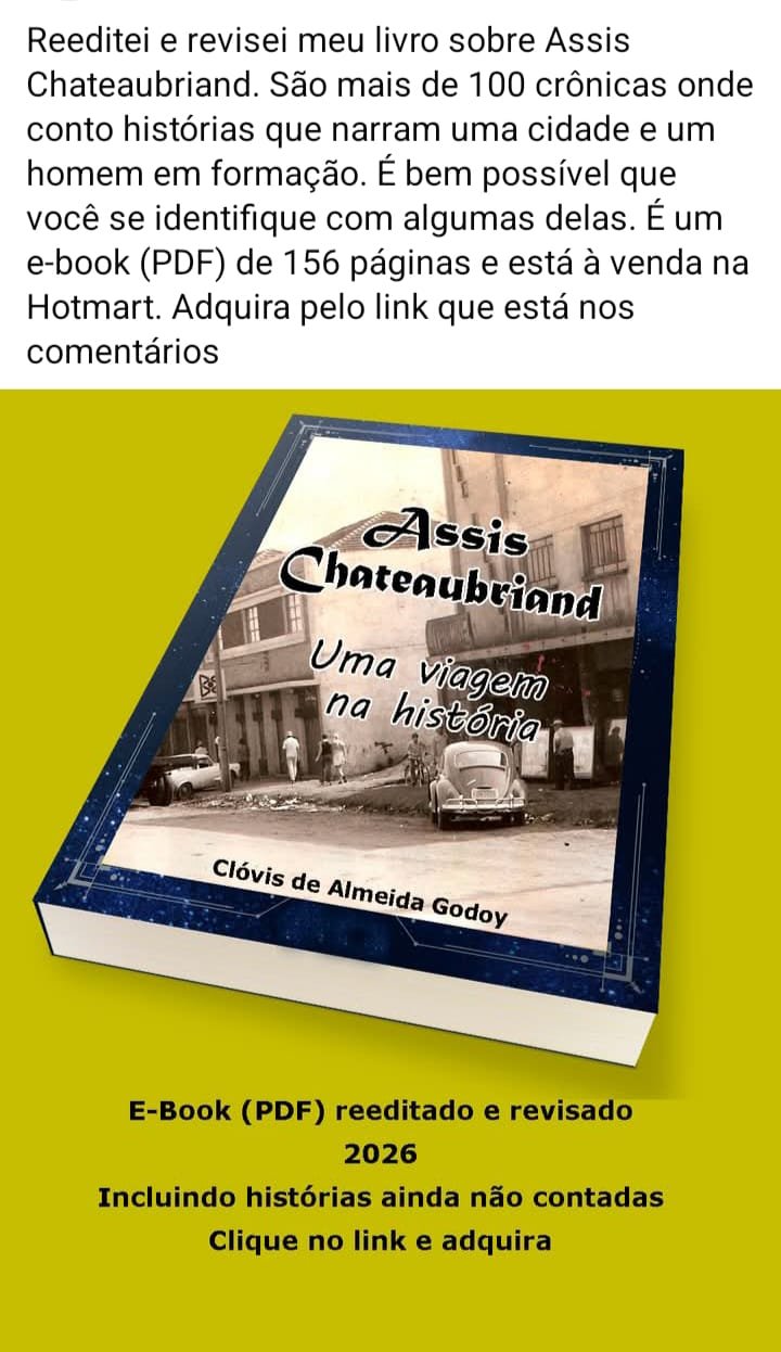 Geral História Regional Social Descubra os segredos e memórias de Assis Chateaubriand 24 de março de 2026 Assis ChateaubriandUma viagem na história Clóvis de Almeida Godoy Descubra as histórias que deram vida a uma cidade! O e-book…