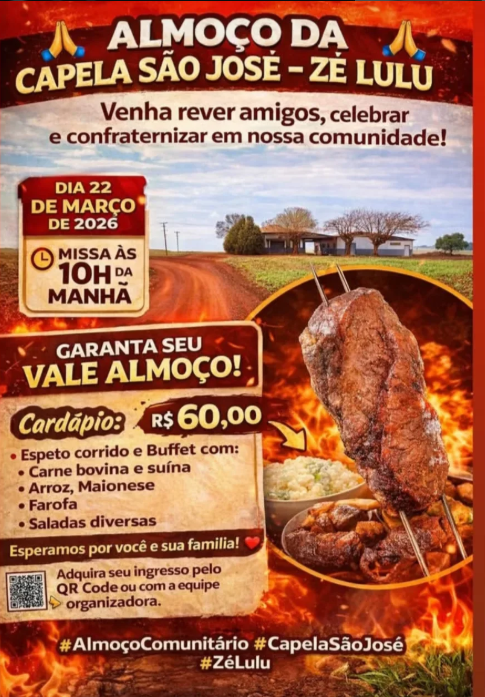 Eventos Geral Religião ALMOÇO DA CAPELA SÃO JOSÉ – ZÉ LULU 19 de fevereiro de 2026 ➡️22/03/2026 ➡️ Missa às 10 H da manhã ➡️ Vale almoço: R$ 60,00 Venha rever amigos , celebrar e confraternizar…