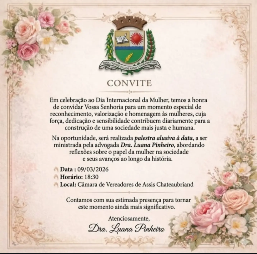 Eventos Geral 🌹❤️ Homenagem ao dia internacional da mulher 8 de março de 2026 Procuradora da mulher, Vereadora Lucia Couto.Procuradora adjunta e Vice presidente da Camara a Vereadora Velandia Belino, e Câmara de vereadores…