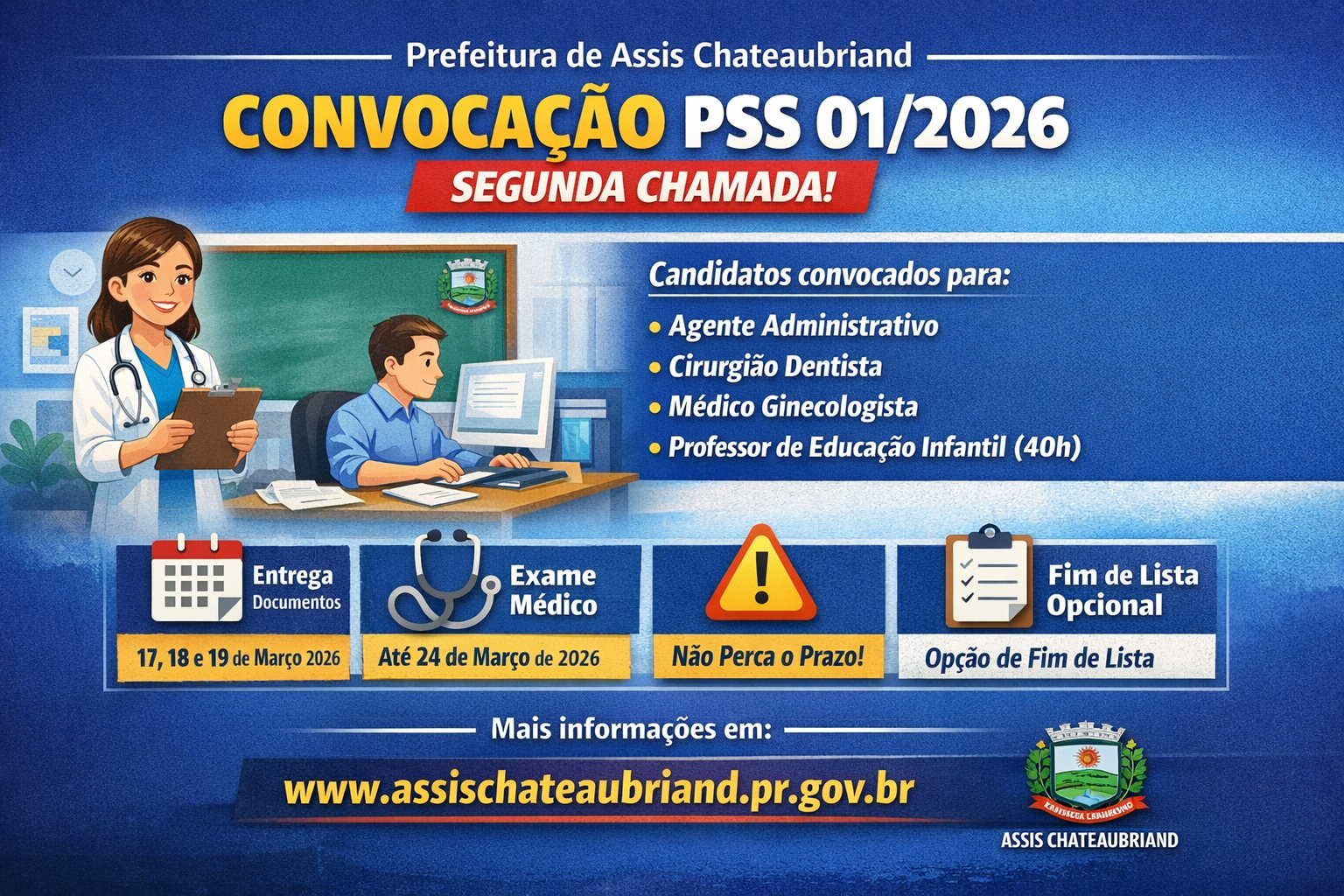 Geral Convocação PSS 01/2026 Prefeitura de Assis Chateaubriand 18 de março de 2026 A Prefeitura de Assis Chateaubriand divulgou nesta terça-feira (17) a segunda convocação dos candidatos aprovados no Processo Seletivo Simplificado (PSS)…